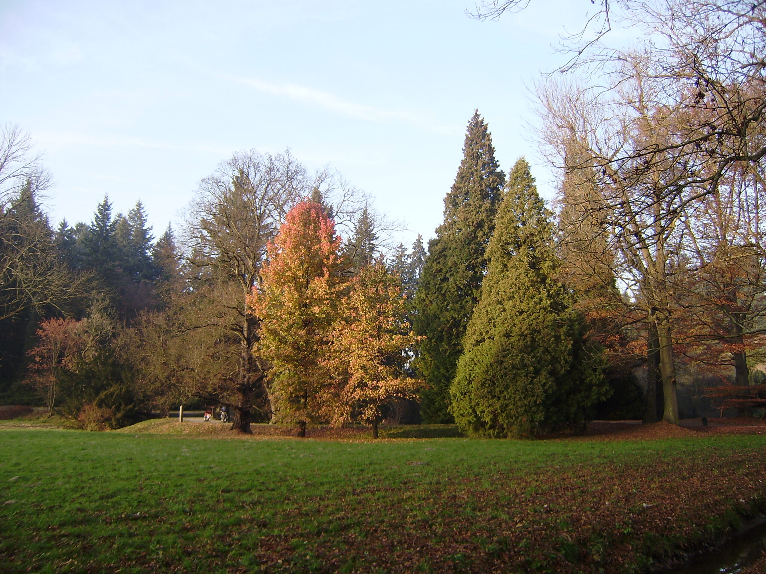 V Průhonickém parku rostou dva druhy zeravů s kuželovitým tvarem koruny: vlevo zerav obrovský (Thuja plicata), vpravo zerav zapadni (T. occidentalis). Liší se mimo jiné i obsahem terpenů v pryskyřici. Foto Jiří Burda
