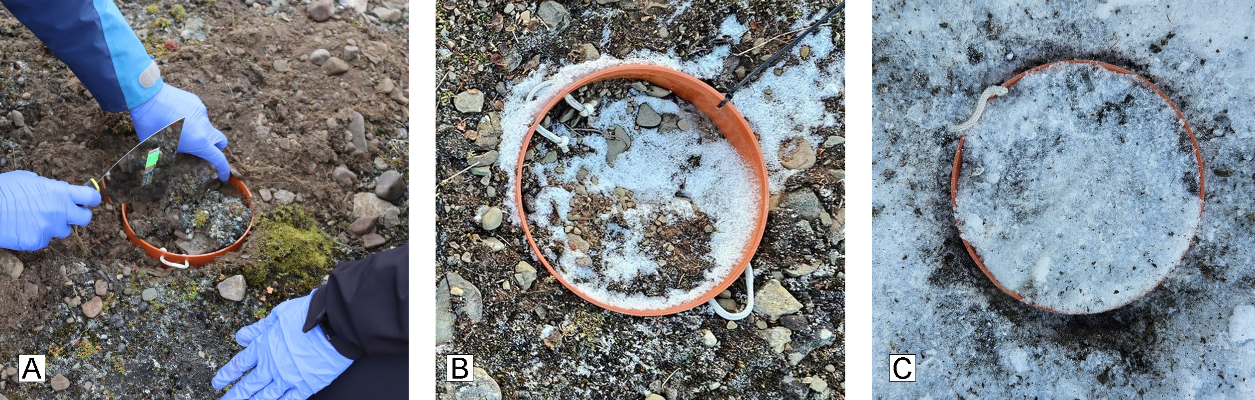 Sezónní sledování biologických půdních krust na Svalbardu: A – založení experimentu v létě; B – stav krusty na podzim; C – krusta po odhrnutí sněhu v zimě.